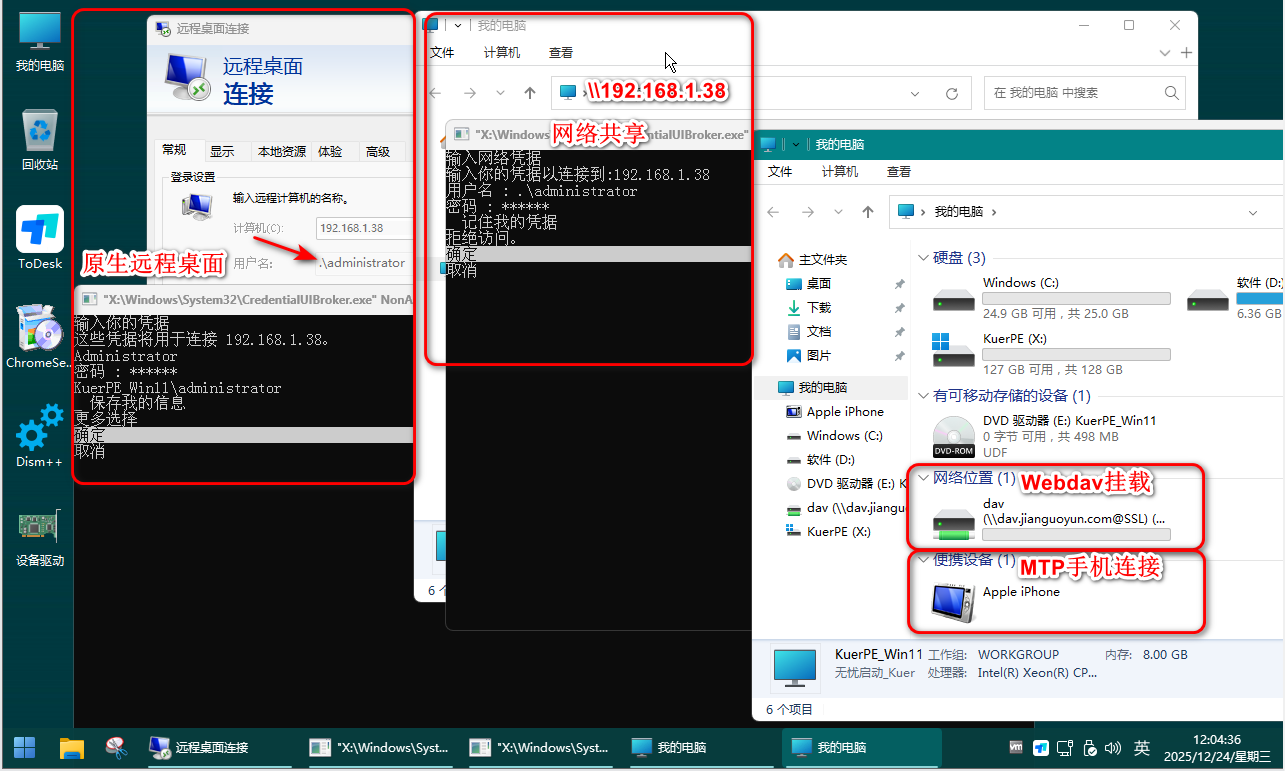 【2025.12.24】KuerPE_23H2.22631.6345_Network.Stable–原生远程桌面、网络共享、WebDav、MTP……